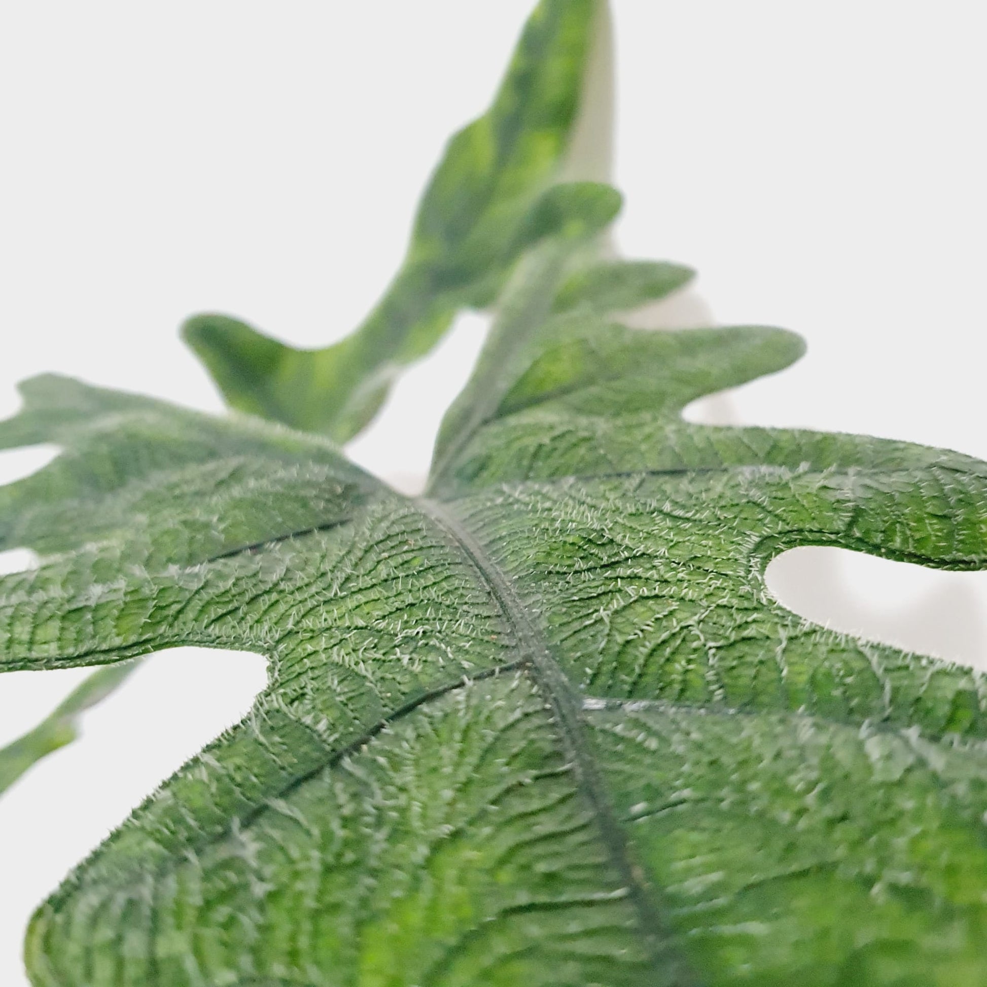 It is a unique large-leafed tuberous plant that possesses uniquely patterned, deeply-lobed, vibrant green, arrow-shaped foliage. Veins appear to be almost blackish green.
